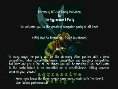 It features fast rotative motion blurr effects and an invitation text (in English) for Aggression's party.